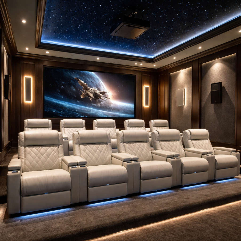 Transform your home into a luxury private cinema with our end-to-end Home Theater Design & Installation Service. We specialize in creating immersive home theater experiences with premium recliner seating, optimal viewing angles, professional layout planning, and seamless installation—all customized to your space and lifestyle.